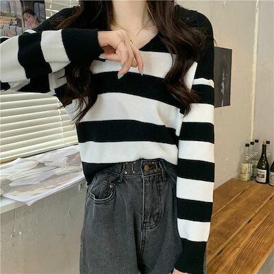 クーポン レディース 韓国ファッション ニット ボーダー セーター Vネック 長袖 トップス カジュアル 学生 ママコーデ スタイリッシュ デイリー 普段着 グリーン ホワイト