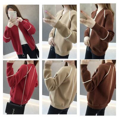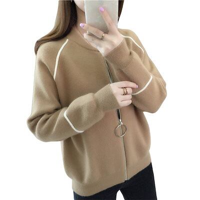 ニット ブルゾン ジップアップ ジャケット スタジャン風 カーディガン レディース 秋冬服 ライン入 ノーカラー ゆったり 大きい おしゃれ 長袖 セーター 前開き 春ファッション リラックス 体型