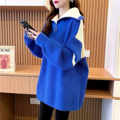 ニット セーター レディース ハーフジップ ゆったり 大きい 長袖 秋冬 タートルネック トップス ボーダーライン プルオーバー バルーンスリーブ ファッション 防寒着 暖かい エレガント アメカジ
