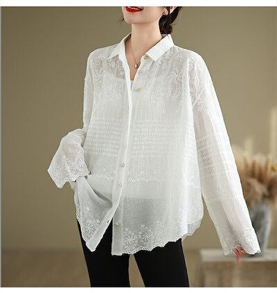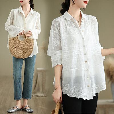 レース シャツ 長袖シャツ レディース トップス 花柄刺繍 前開き カーディガン 透け感 キレイめ 春 夏 秋 大人可愛い 通勤 オフィス フェミニン 森ガール ゆったり 大きいサイズ 体型カバー