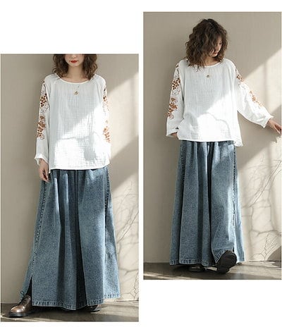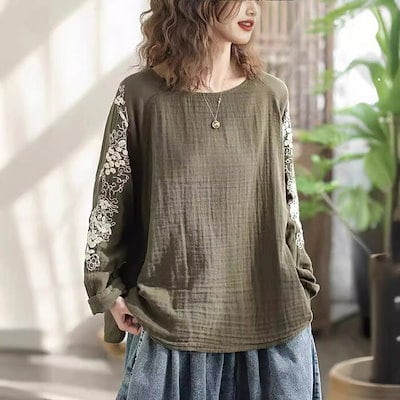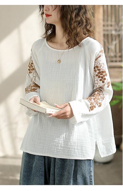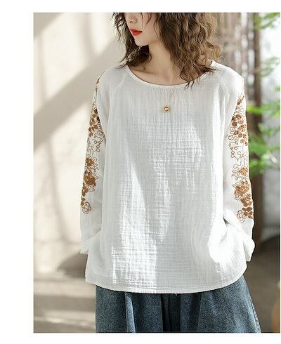 ブラウス レディース 秋 冬 刺繍 トップス 綿麻風 クルーネック プルオーバー 大きいサイズ ゆったり 体型カバー きれいめ 無地 ナチュラル 大人可愛い 女性 カジュアル ホワイト 白 グリーン