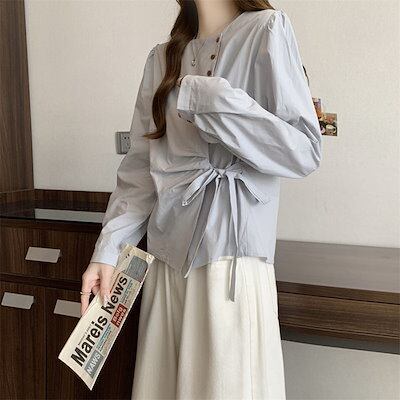 ブラウス レディース シャツ アシンメトリー シャツブラウス 長袖 クルーネック 無地 サイドリボン トップス デザイン シンプル カジュアル 大人可愛い キレイめ 通勤 オフィス 仕事 おしゃれ ゆ