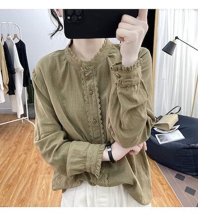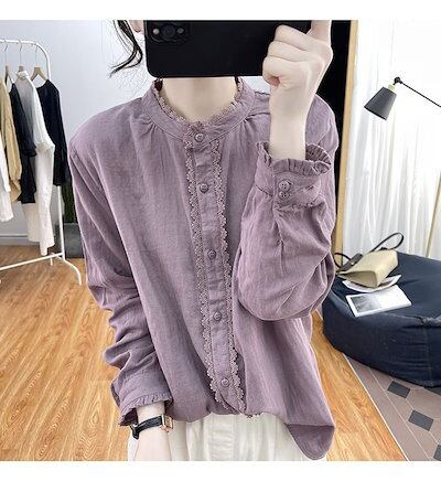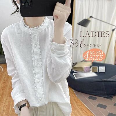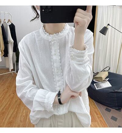 ブラウス レディース シャツ 長袖 シャツブラウス レース 白ブラウス バンドカラー ブラウスチュニック 綿混 トップス 無地 前開き スーツインナー お洒落 可愛い カジュアル オフィス 無地 シン