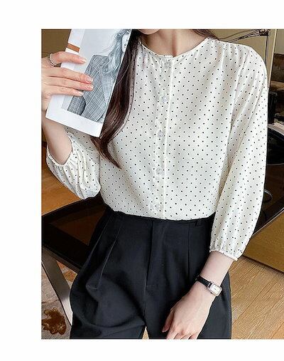 ブラウス レディース 七分袖 シャツ 水玉 クルーネック ドット柄 シフォン シャツブラウス ブラウスチュニック 丸襟 春夏秋 トップス ゆったり カジュアル シンプル 薄手 オシャレ 大きいサイズ