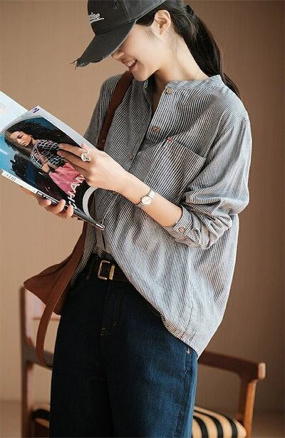 シャツ スタンドカラーシャツ 秋 ストライプ シャツ レディース 長袖 コットン バンドカラーシャツ 前開き 綿混 通勤 通学 ゆったり 大きいサイズ キレイめ カジュアル シンプル 大人 ベーシック