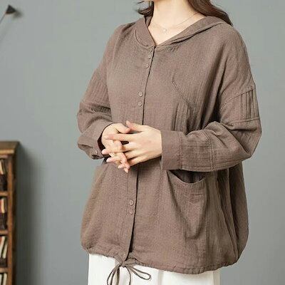 綿シャツ ブラウス レディース 長袖 フード付き シャツブラウス トップス ガーゼシャツ 柔らか ゆったり ビジネス 大人可愛い オフィスカジュアル シンプル カジュアル 春秋 着心地よい 前開き ブ