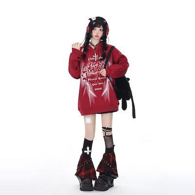 パーカー 黒と赤のレトロなルーズなフード付きのスウェットシャツレディース秋と冬のファッションプルオーバースウェットシャツ