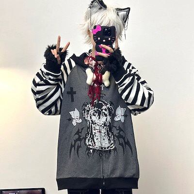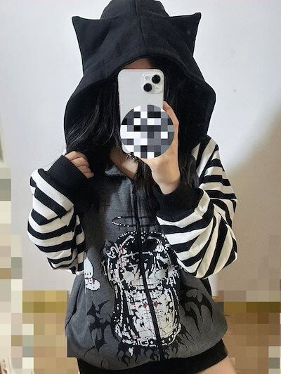 ジャケット 猫耳ストライプサブカルチャーパンクパッチワークルーズデビルプリントスウェットシャツジップフード付きジャケット
