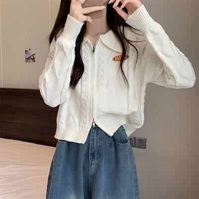 ニットカーディガン ショートツイストジャンパーカーディガン女性の春と秋の緩いラペル長袖ニットジップジャケットの外