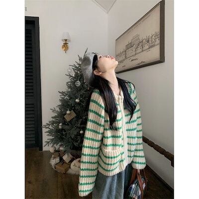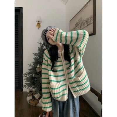 ニットカーディガン レトロなダブルジップストライプジャンパージャケット女性秋冬ルーズニットカーディガントップス