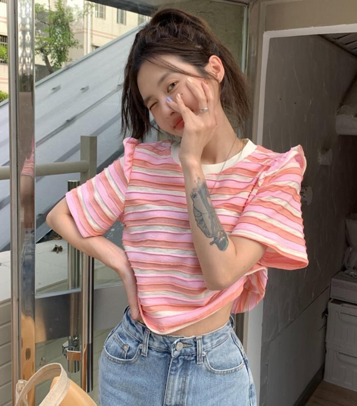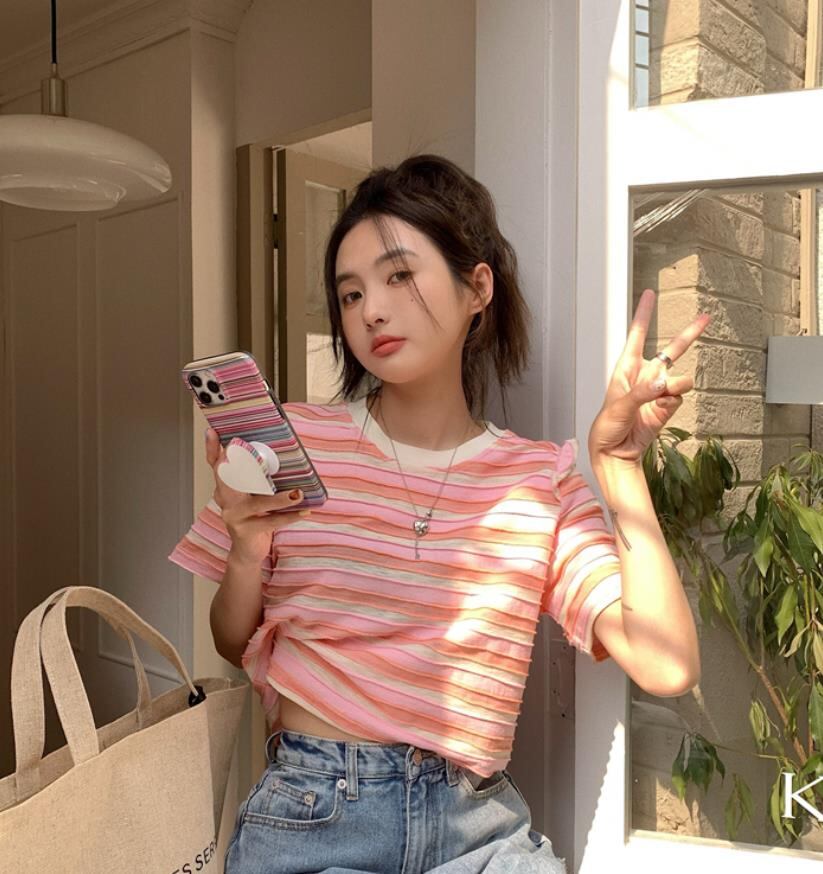 2022春夏新作 レディース 女 丸首 ボーダー柄 半袖 Tシャツ トップス インナー 2色