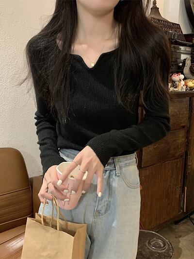 柔らかい小さなVネックピットストライプ内側フレンチレトロスクエアネック気質春ジャンパーニッチニットボトムシャツ