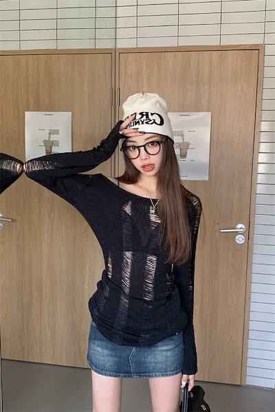 グリーンホローアウトニットセーターカバーアップストラップレス秋フレンチデザインセーター長袖スパイスガールワンショルダートップス女性