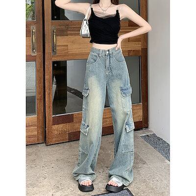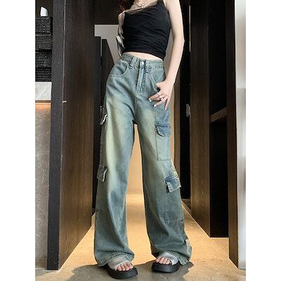 アメリカンワークウェアジーンズ女性夏2023新しい甘いクールなデザインセンスハイウエスト細いワイドレッグドラッグズボン潮
