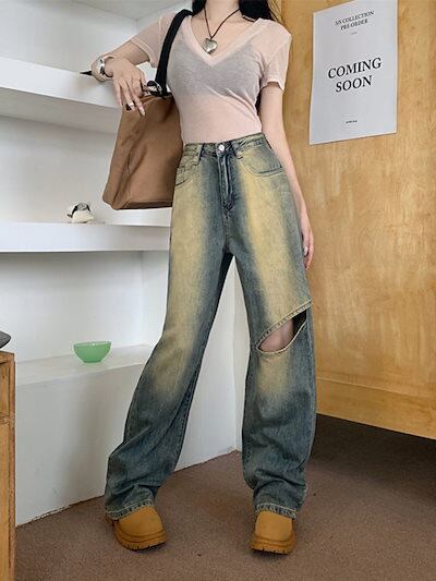 アメリカンジーンズ女性夏2023新しいレトロなカラーブロッキングデザインセンスハイウエスト薄いワイドレッグロングパンツ