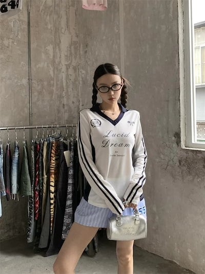 2024秋 長袖 TシャツVネックショート丈 カットソーワッペンK-POPトップス カジュアル配色韓国系ストリートへそ出しタイトネックスリーブ 肌見せ T ファッションレディースかわいいサイド衣装風冬
