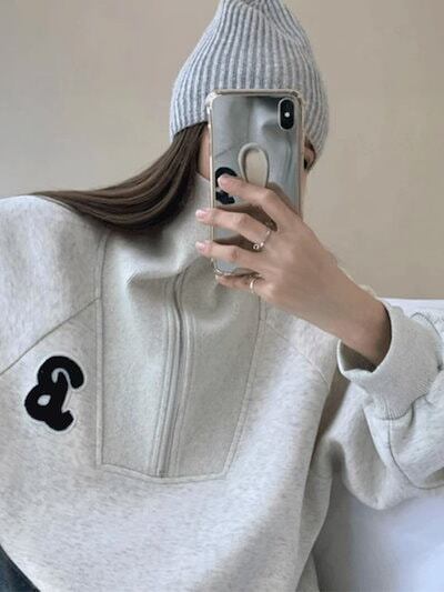 2024 秋冬 2TYPE 裹起毛トップス長袖かわいいプリントK-POPTロングレディース韓国風衣装カラールーズゆったりカジュアルハーフおしゃれサイズスリーブシルエットファッション系サイドシャツグレー