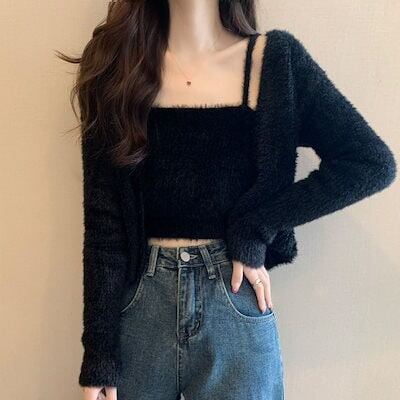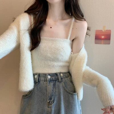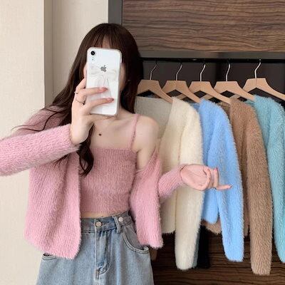 2024 秋冬かわいい人気 トップス 長袖 ニット無地レディースショート 羽織りファッション系 ルーズ ネック女っぽカジュアルボレロゆったり 大人っぽ春セーターフレンチ型 2点