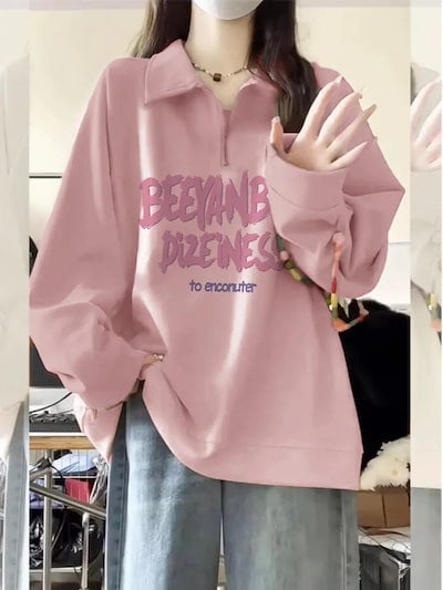 2024 秋冬 2TYPE 厚手裹起毛トップス長袖 かわいいプリントK-POPTロングレディース韓国風衣装カラールーズゆったりカジュアルハーフおしゃれサイズスリーブシルエットファッション系サイドシャツ