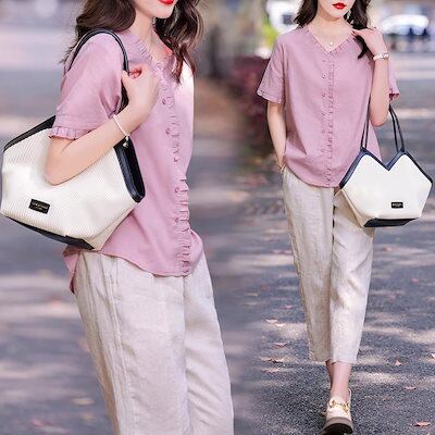 涼しく楽ちんセットアップ 綿麻スーツ新型婦人服2024夏モデル中年ママ半袖九分パンツ セットアップ レディース 夏 韓国 半袖 ルームウェア スウェット上下セット スーツ