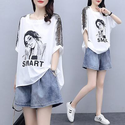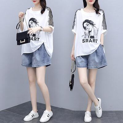 涼しく楽ちんセットアップ レディース 夏 2024夏の新ゆったり着やせスーツ女性デニムパンツ+Tシャツの2点セット 韓国 半袖 ルームウェア セットアップ スウェット上下セット スーツ