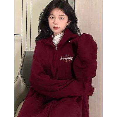 人气新作韓国 パーカー 着痩せ 長袖tシャツレディース Tシャツパーカーレトロなワインレッドの文字がプリントされたセーター 新しい秋と冬のジップカーディガンジャケットインス