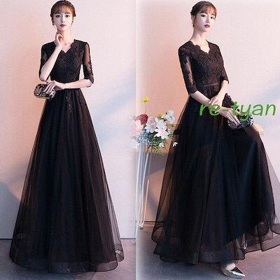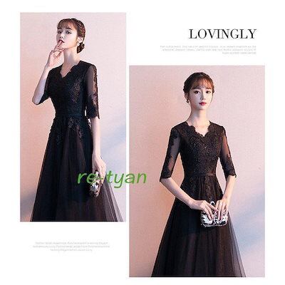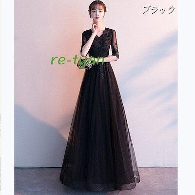 ロングドレス 黒 演奏会パーティードレス 結婚式 ワンピース 発表会 20代 30代 40代 50代 春夏秋冬 ファスナー 大きいサイズ フォーマル二次会上品 Vネック
