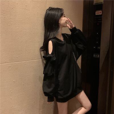 2色/オープンショルダーリボントレーナー スウェット トップス プルオーバー 長袖 ルーズ トレンド シンプル カジュアル レトロ 韓国ファッション 2color