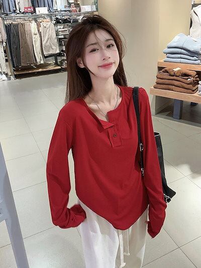 2024春夏トップス Tシャツ 長袖 ラウンドネック ボタン 薄手 ゆったり 細見え 夏 白 赤 おしゃれ かわいい 韓国ファッション レディース お出かけ