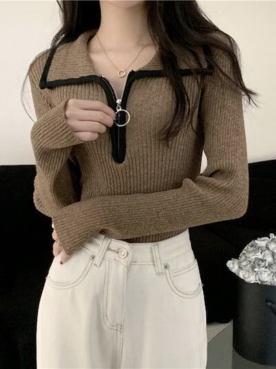 2024秋 冬トップス 長袖 ニット セーター レディース ショート おしゃれ カラバリハーフカラースタイルアップ 色っぽ 女っぽ カジュアル きれいめ 大人 ネック ファッション フェミニン 春
