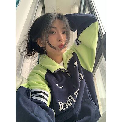 2024秋冬 2TYPE 裹起毛トップス長袖かわいいプリントK-POPTバイカラーロングレディース韓国風衣装カラールーズゆったりカジュアルハーフおしゃれサイズスリーブシルエットファッション系サイド