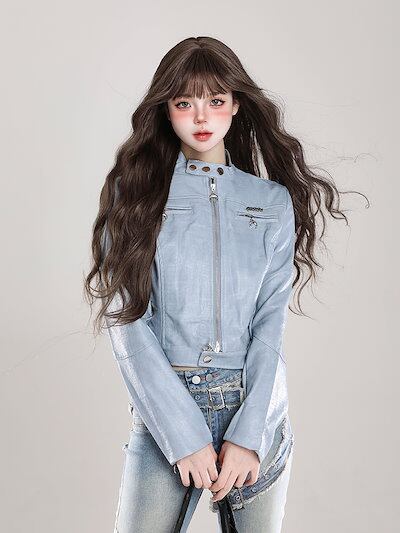 2024秋冬 長袖 ジャケット かわいい ハイネックスタンドネックショート アウター丈羽織り合成バイカラーフェイク黑カジュアル シルエットゆったりファッション系サイズ 色っぽ 女っぽきれいめ大人っぽ