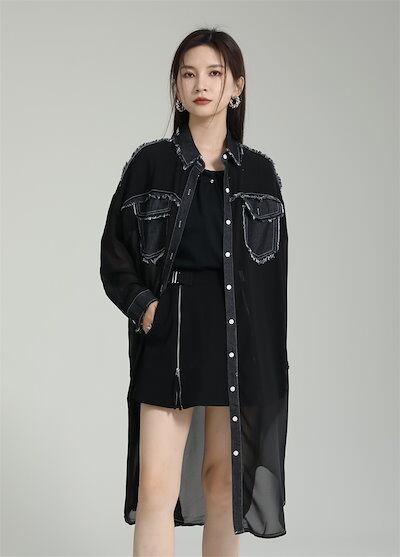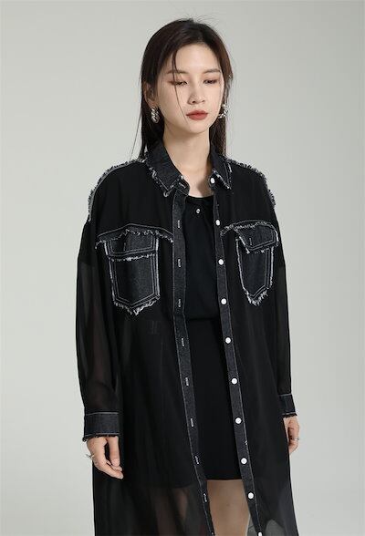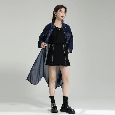 【J.Fashion】新品 デニムドッキング 夏 ロング丈 シアーシャツ シフォン 透明 カーディガン 日焼け止め 体型カバー チュニック ロングカーディガン 紫外線対策 ロングブラウス メガ割