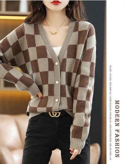 ニットカーディガンニット レディース カーディガン トップス 長袖 チェック柄 Vネック カットソー 厚手 オフィス アウター 大きいサイズ ゆったり カジュアル 黒 春 冬 秋