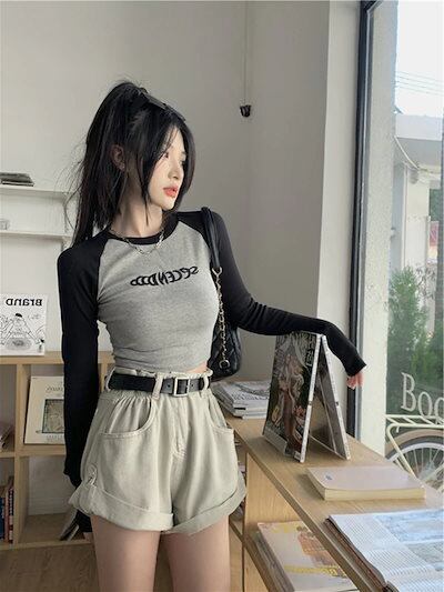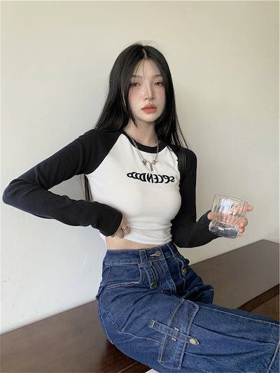 2024夏 韓国 トップス 長袖 可愛い おしゃれ タイトフィット カットソー ラウンドカラー 重ね着丈 スリーブ 女っぽ レディース Tファッション系 フェミニン きれいめ 色っぽ プリント
