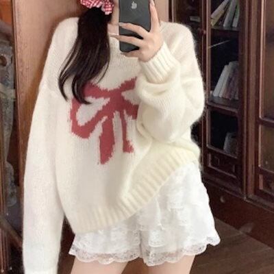 2024秋冬トップス セーター ニット ラウンドネック 長袖 ゆったり 秋 白 ホワイト おしゃれ かわいい キュート 甘め 韓国ファッション レディース お出かけ