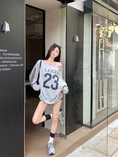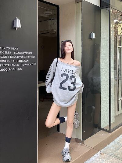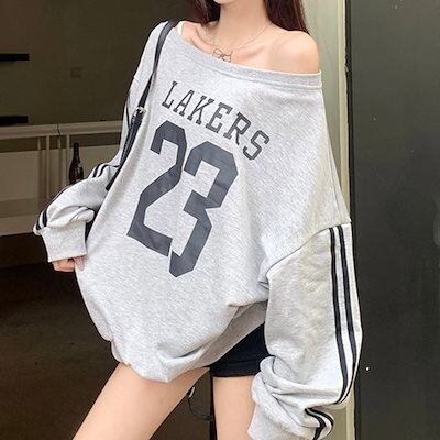 2024 秋冬トップス 長袖 肩見せ 数字 23 英語 ストライプ ゆったり 細見え 秋 グレー おしゃれ かわいい 韓国系ファッション レディースサイド お出かけ