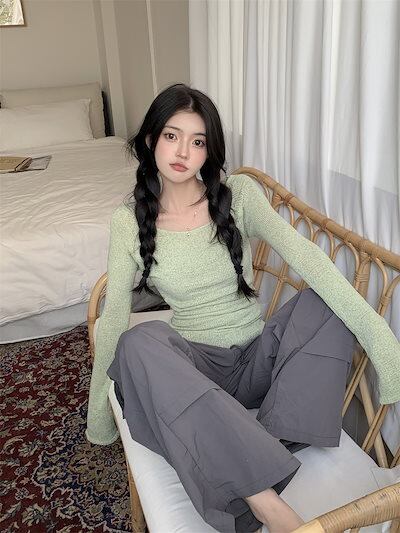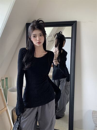 2024春秋 ニットトップス 2点セット レディースレースアップ長袖 韓国系ファッション 可愛い ニット プルオーバー セクシー ニット ショート丈トップスおしゃれ 薄手透け感 クロシェ