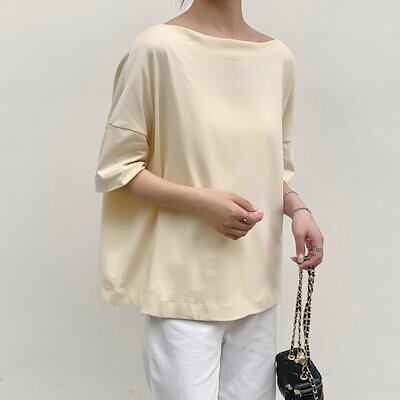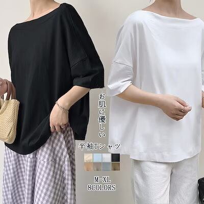 【2枚購入で 2oo円OFF!】8色 夏新作 シンプル おしゃれ カジュアル ボートネック半袖 ゆったりTシャツ ショット丈 トップス 着痩せ アウター レディースファッション ロンt Tシャツカ
