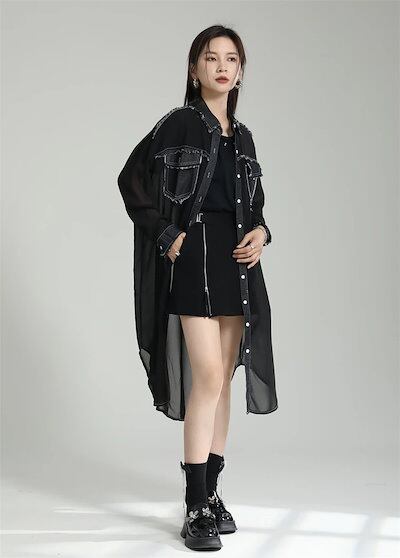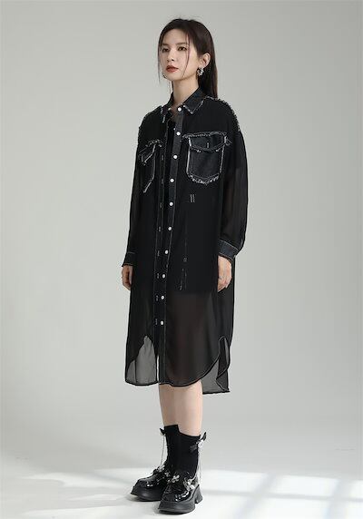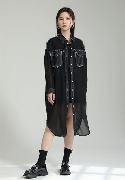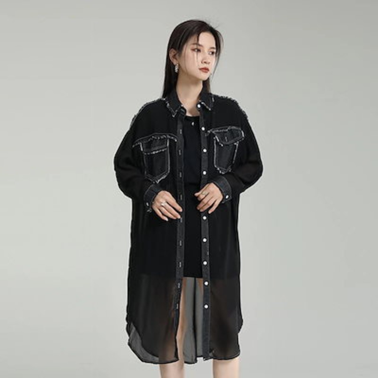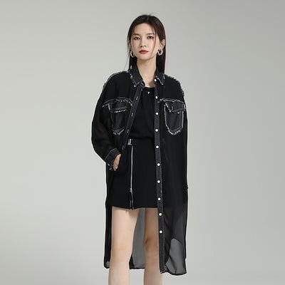 【J.Fashion】新品 デニムドッキング 夏 ロング丈 シアーシャツ シフォン 透明 カーディガン 日焼け止め 体型カバー チュニック ロングカーディガン 紫外線対策 ロングブラウス メガ割