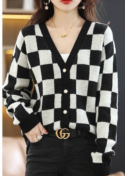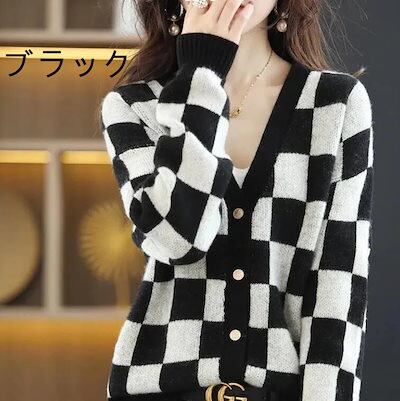 ニットカーディガンニット レディース カーディガン トップス 長袖 チェック柄 Vネック カットソー 厚手 オフィス アウター 大きいサイズ ゆったり カジュアル 黒 春 冬 秋