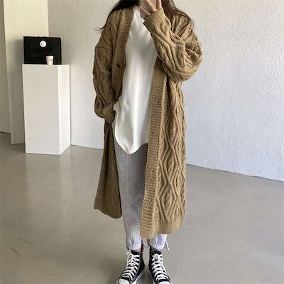 ニットカーディガンカーディガン ケーブル編みニット レディース ロング丈 秋 冬 ロングカーディガン ニットカーディガン カーデ コート アウター 厚手 あったか ニット セーター ビッグシルエット