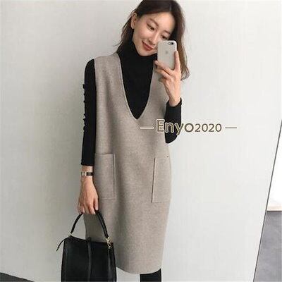 【即納】ワンピース ジャンパースカート 2点セット レディース ポケット付き ニット付き Vネック ロング丈 秋冬 上品 通勤 普段着 オシャレ 着痩せ