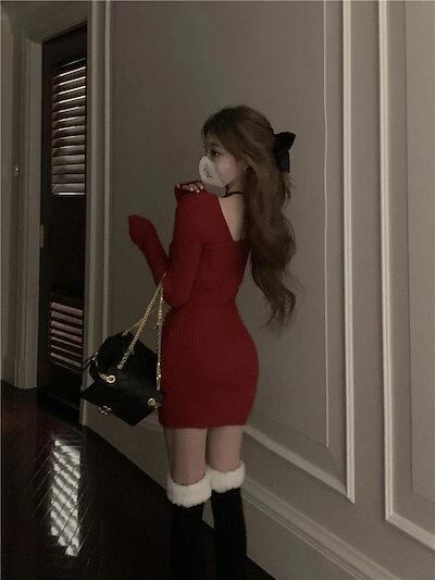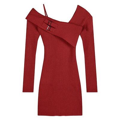 ニットワンピース長袖 セクシーオフショルダーネックレディースファッション無地セミロングセーター