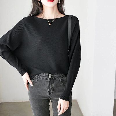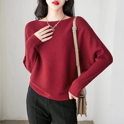 人気なリブニット Tシャツカットソー 春 ベーシックニット バットウィングスリーブ セーターレディース ゆったり ニットトップス 長袖