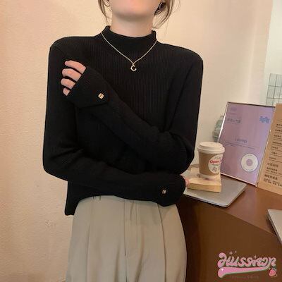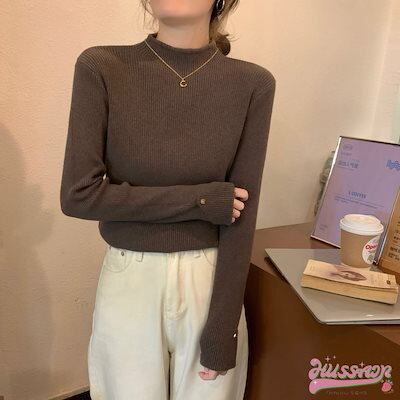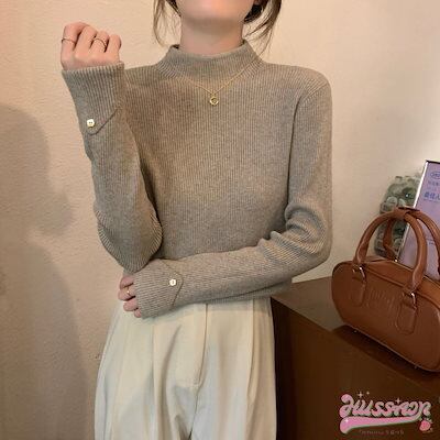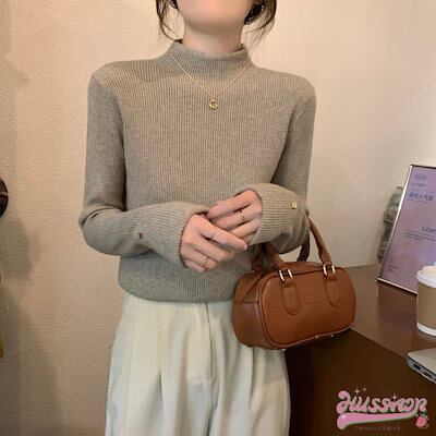2024春夏レディース 長袖リブニット トップス ニット リブニット ボトルネック 長袖 袖口ボタン リブトップス 長袖ニット プチハイネック アースカラー オシャレ シンプル 可愛い キレイめ 上品