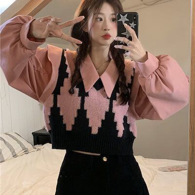2024 春夏【2点セット】カジュアルにも シャツ ニット ベスト ブラウス バルーン ボリューム ショート風ゆったり ネック カジュアル きれいめ 韓国っぽ ファッション かわいい