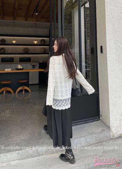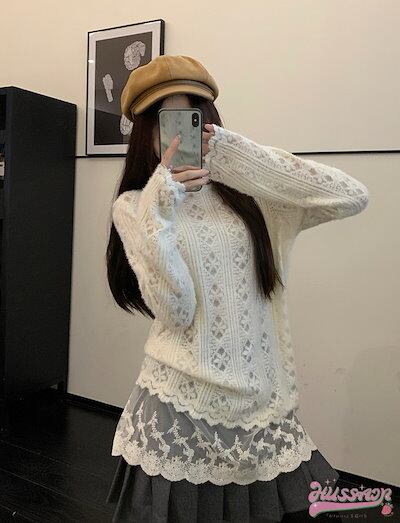 トップス Tシャツ レース 透かし彫り ハイネック 丈長め 長袖 スリム 細見え 秋冬 白 韓国ファッション レディース おしゃれ かわいい 甘め ガーリー キュート カジュアル お出かけ