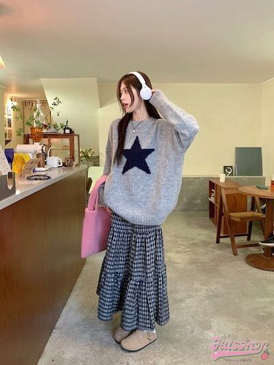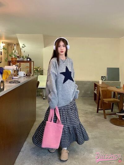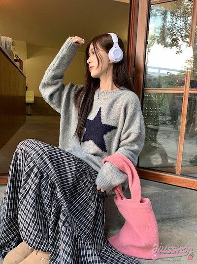 トップス ニット セーター グレー ラウンドネック ゆったり 大きめサイズ 丈長め 長袖 秋 韓国ファッション レディース おしゃれ かわいい カジュアル お出かけ