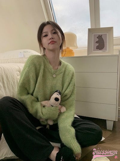 トップス ニット セーター グリーン 緑 ラウンドネック ゆったり 秋 かわいい おしゃれ カジュアル 韓国ファッション レディース お出かけ
